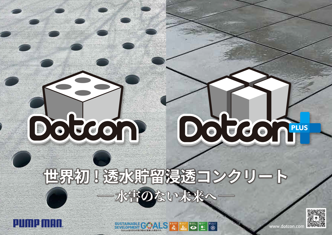 Dotconは、コンクリート本来の強度はそのままに、地面への透水性を飛躍的に高めた、世界初の「透水貯留浸透コンクリート」。